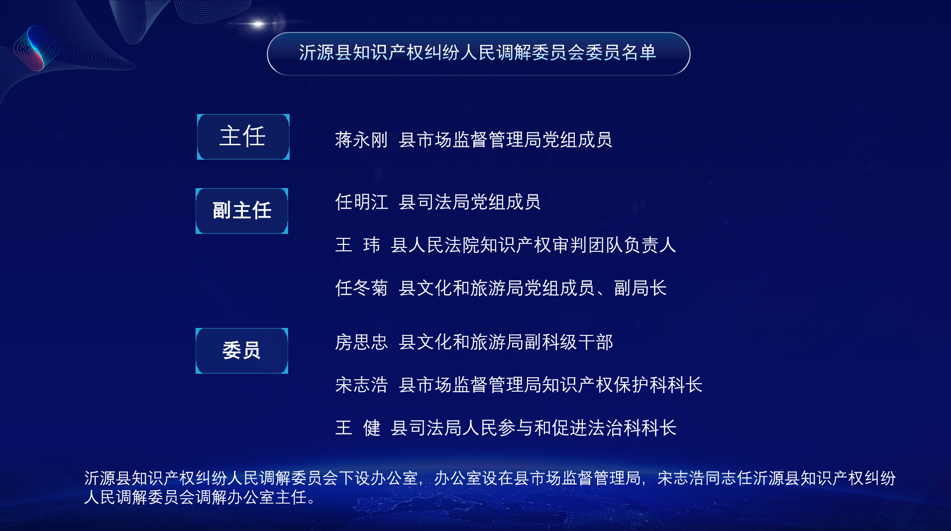 为进一步完善知识产权纠纷多元解决机制,加强行业性、专业性知识产权纠纷人民调解组织建设,营造我县良好营商环境,推进知识产权大保护格局的构建,经研究,决定设立沂源县知识产权纠纷人民调解委员会。
