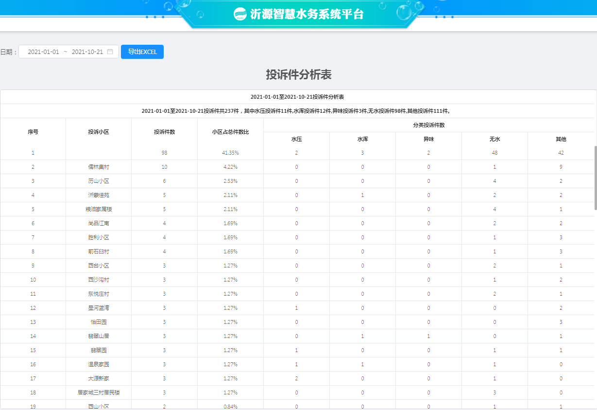 该系统对水源水、水厂水、管网水的浊度、PH值、余氯等水质指标实现在线监测;用户水量、水费等客户服务数据实现全过程实时管控,供水能力得到有效保障;客户服务模块业务接入智慧水务系统平台,各责任科室共享客户服务热线指令,精确分工迅速落实及时反馈,提高用户诉求接办效率,系统的分析用户诉求类型,客户服务能力得到有效提高。