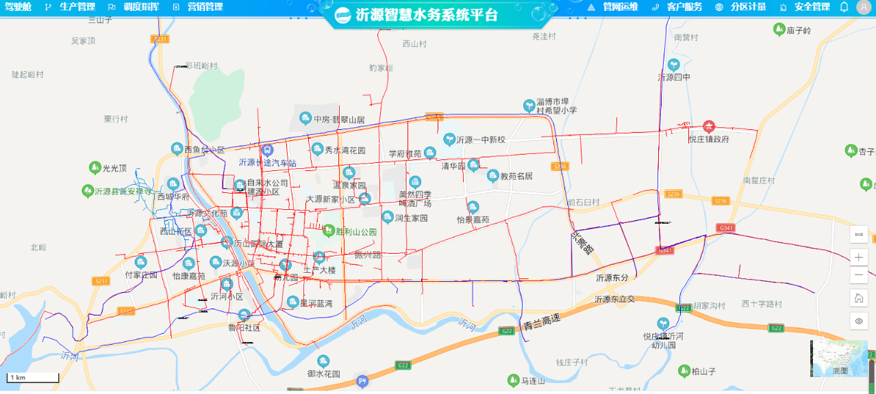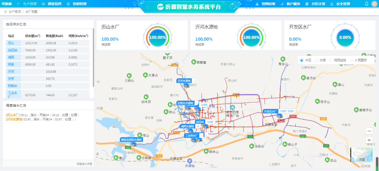 沂源县自来水有限公司智慧水务平台,以地理信息系统(GIS)为核心,整合了供水调度系统、分区计量系统、远传水表系统、营业收费系统、巡检抢修系统、视频监控系统,2021年新建二次供水系统、水厂管理系统、安全管理模块、客户服务模块,以多样的数据即时报警、数据动态分析和智能辅助决策系统为手段,实现水厂管理、压力管理、供水管网的检修与维护、抄表收费的全过程实时管控。“智慧水务”平台的不断完善,不仅大幅减少了跑冒滴漏水现象,降低漏损率,节约了水资源,而且也大大的提高了供水服务质量,实现供水生产运行全程可视化、远程化、自动化管理,确保了供水安全。
