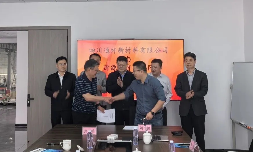 在四川通纤新材料有限公司,张涛一行走进生产车间查看衬垫保温材料生产线,座谈了解公司多晶纤维衬垫、隔热保温产品和陶瓷纤维纸等产品生产及技术情况,推介沂源新材料产业发展优势,推动双方在新能源电池保温隔热材料方面的生产合作,双方现场签订了合作框架协议。