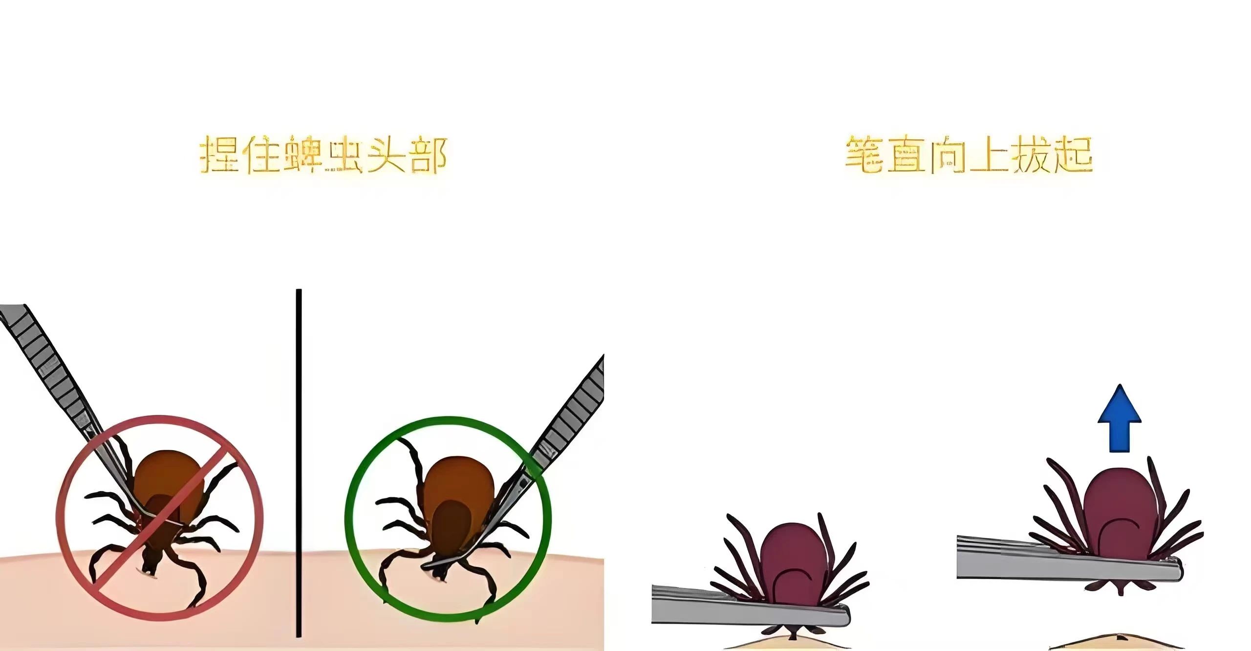 4.科学处理:若被蜱虫叮咬,勿强行拍打或硬拔!应用镊子贴近皮肤夹住蜱虫头部,垂直缓慢拔出,消毒后就医观察。