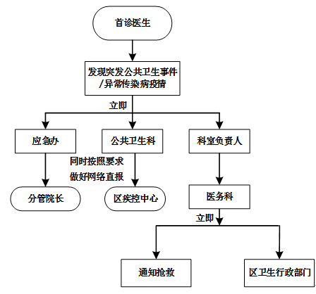 5.1.1.实行首诊医生负责制,在接诊中发现疑似突发公共卫生事件或异常传染病疫情时,应详细了解事件发生时间、地点、波及范围、病人数量、分布特征以及事故发生经过,并立即通知应急办、公共卫生科和科室负责人;科室负责人报告医务科;应急办报告医院领导;公共卫生科报告区疾病预防控制中心,并于2小时内对报告信息进行网络直报,医务科报告区卫生行政部门。