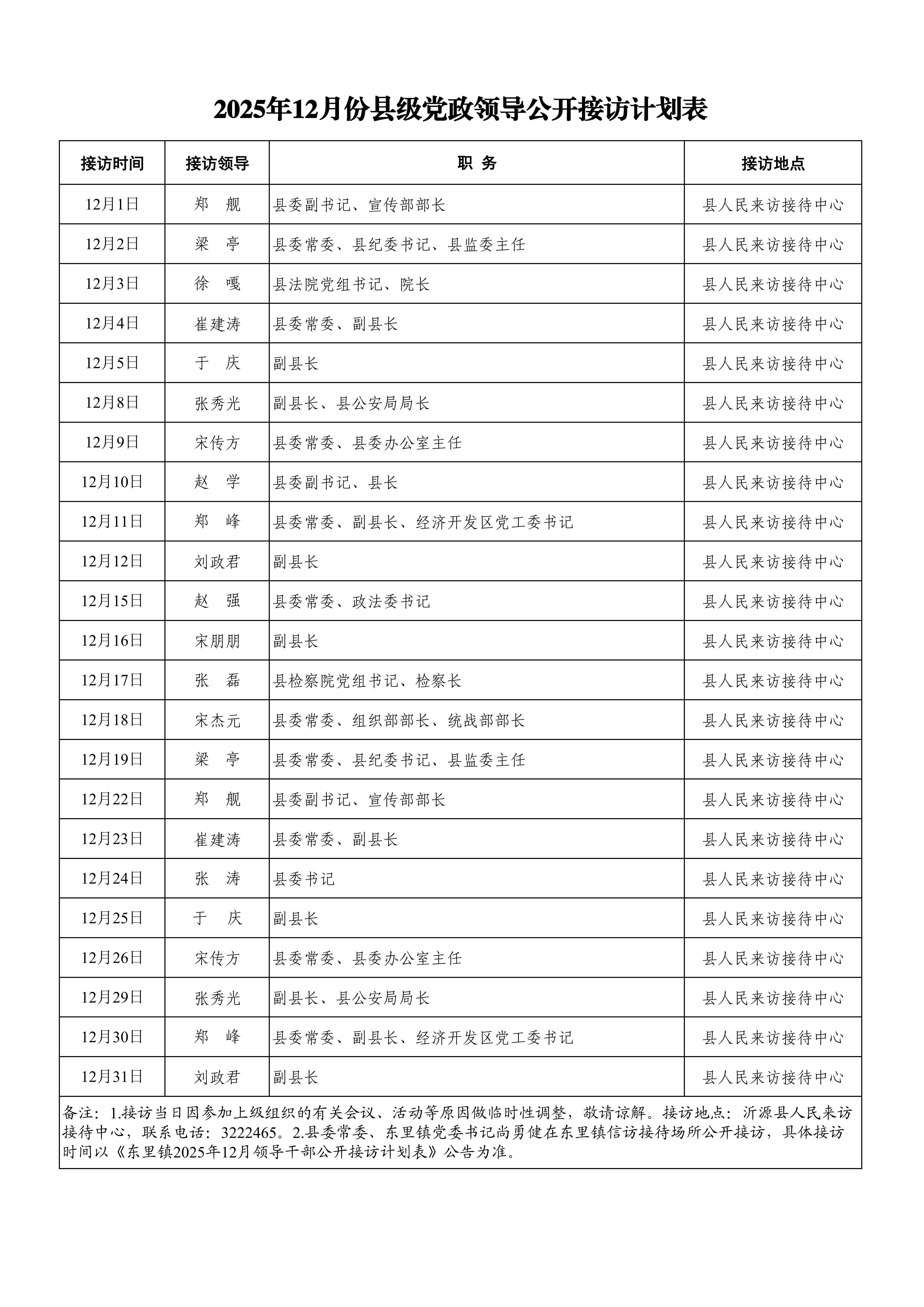 2025年12月份县级党政领导公开接访计划表