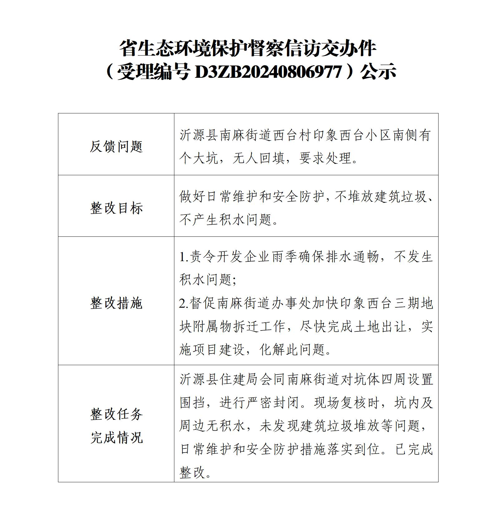 省生态环境保护督察信访交办件(受理编号D3ZB20240806977)公示