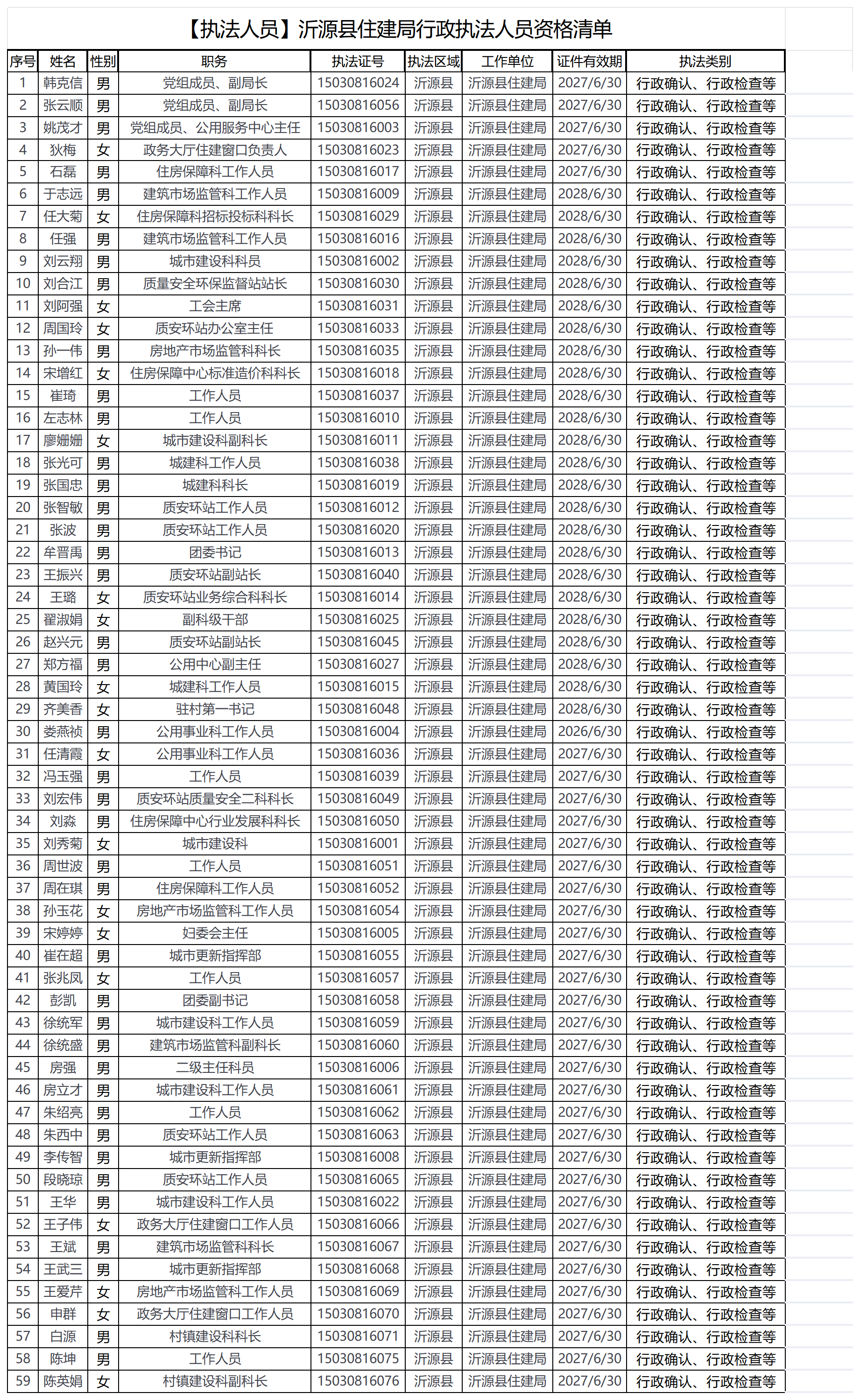 【执法人员】沂源县住建局行政执法人员资格清单