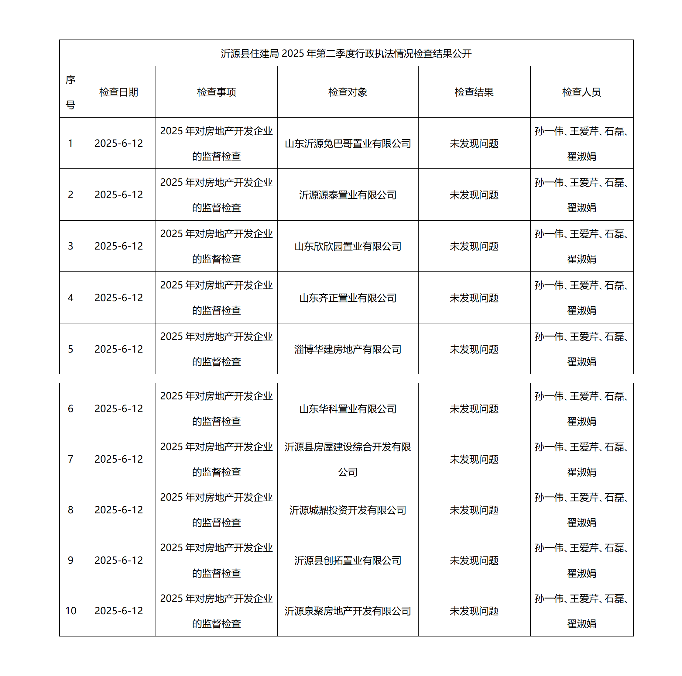 沂源县住建局2025年第二季度行政执法情况检查结果公开
