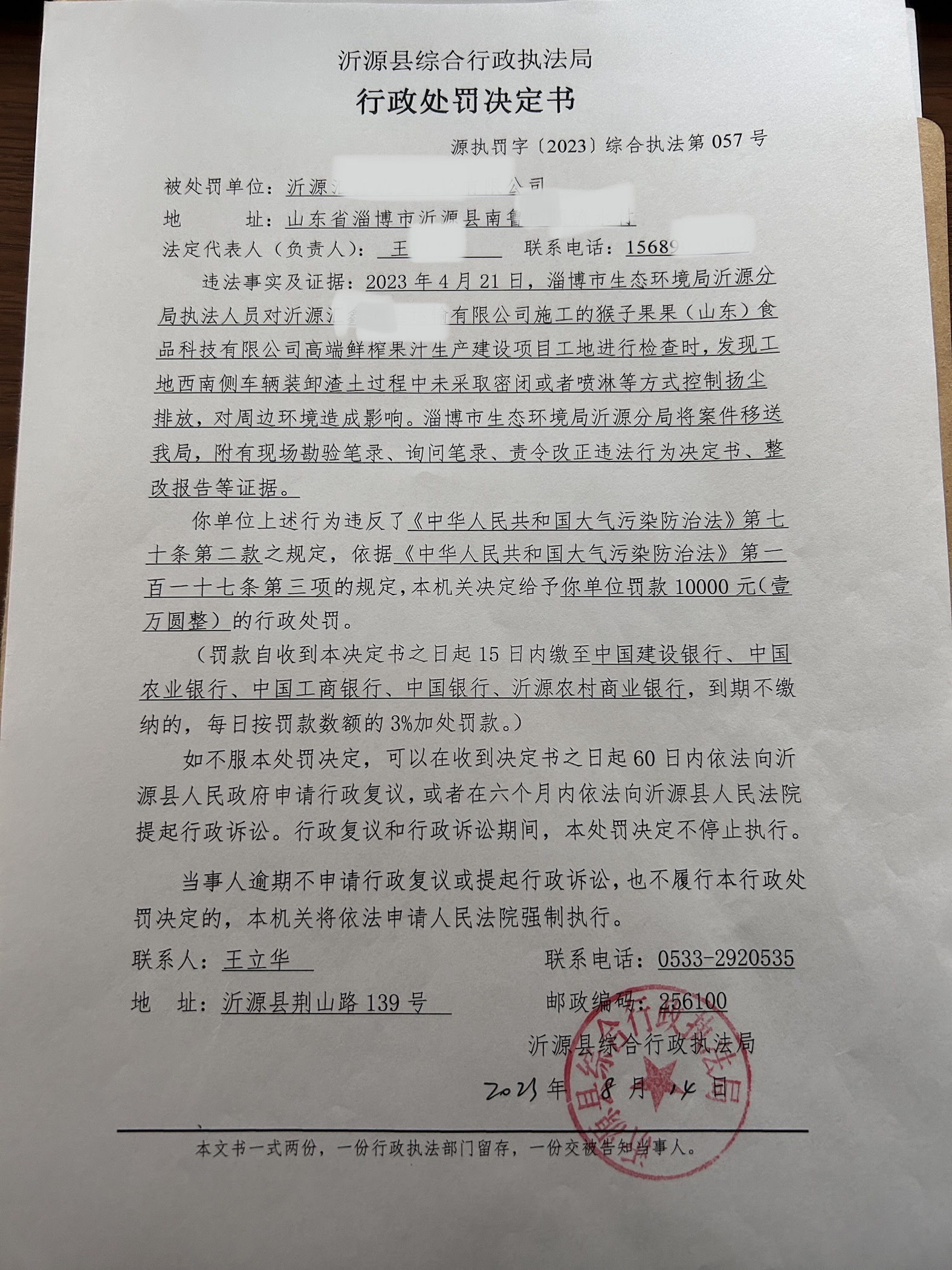沂源县综合行政执法局8月执法结果