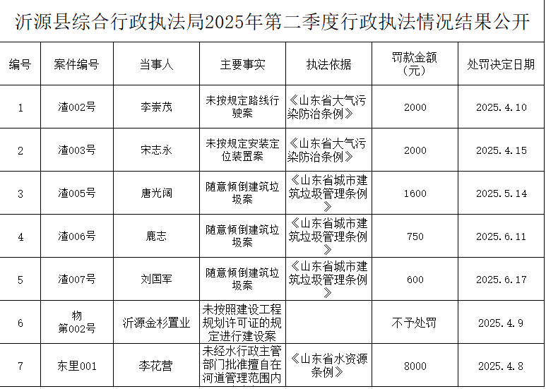 沂源县综合行政执法局2025年第二季度行政执法情况结果公开