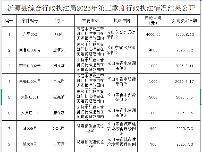 沂源县综合行政执法局2025年第三季度行政执法情况结果公开