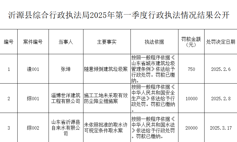 沂源县综合行政执法局2025年第一季度行政执法情况结果公开