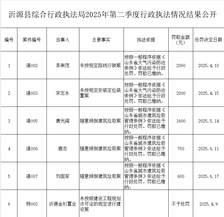 沂源县综合行政执法局2025年第二季度行政执法情况结果公开