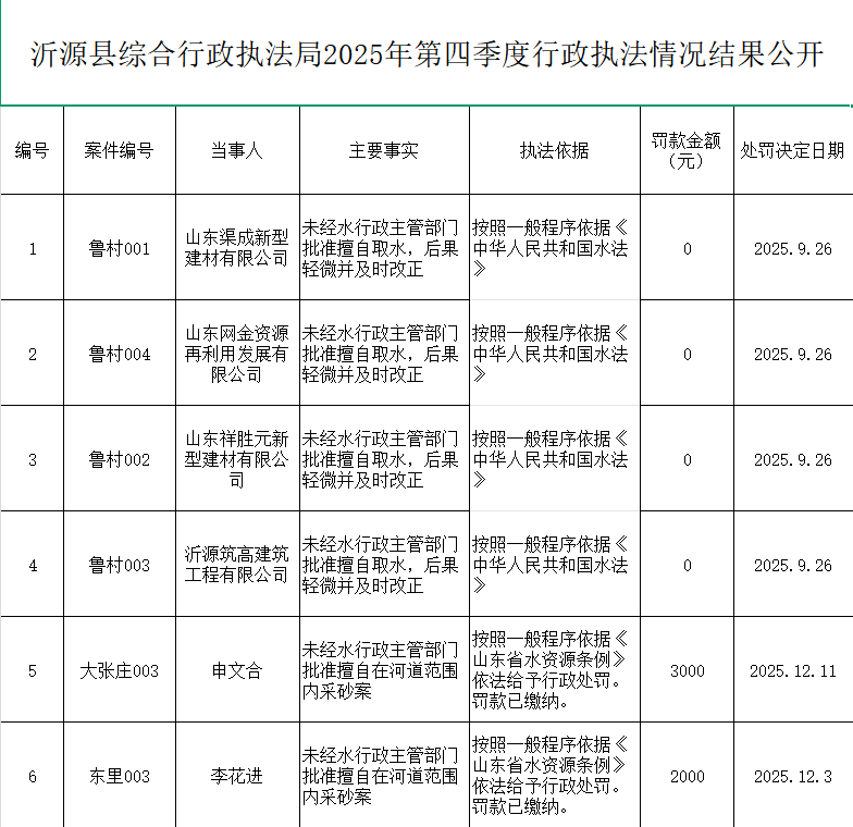 沂源县综合行政执法局2025年第四季度行政执法情况结果公开