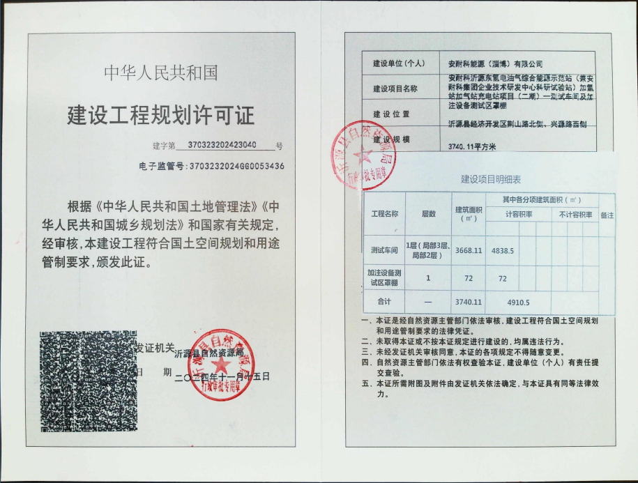 安耐科沂源东氢电油气综合能源示范站(兼安耐科集团企业技术研发中心科研试验站)加氢加气站充电站项目(二期)-测试车间及加注设备测试区罩棚建设工程规划许可批后公示