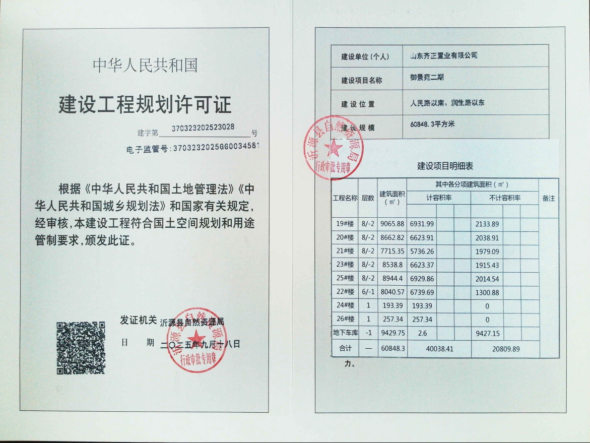 建设工程规划许可证批后公示【山东齐正置业有限公司御景苑二期】