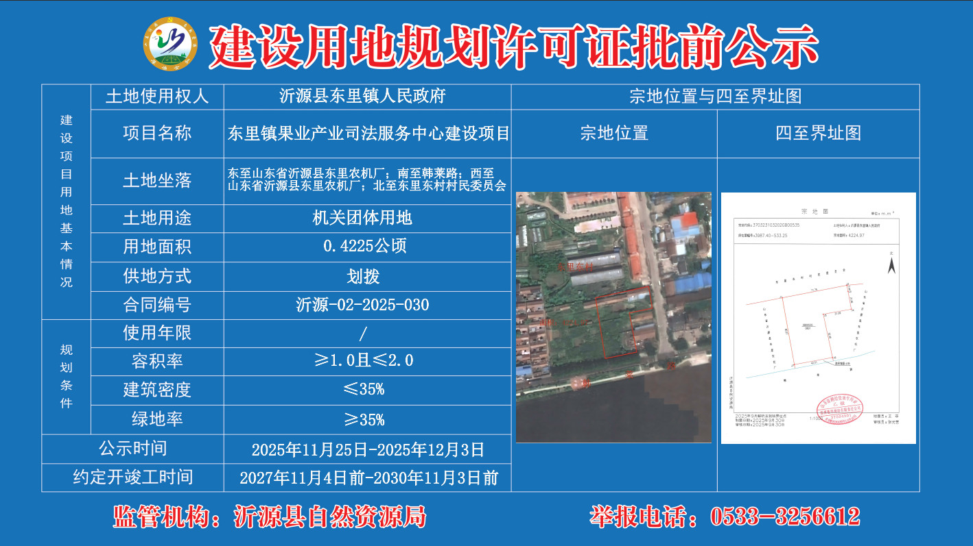建设用地规划许可证批前公示【2025】东里镇果业产业司法服务中心建设项目