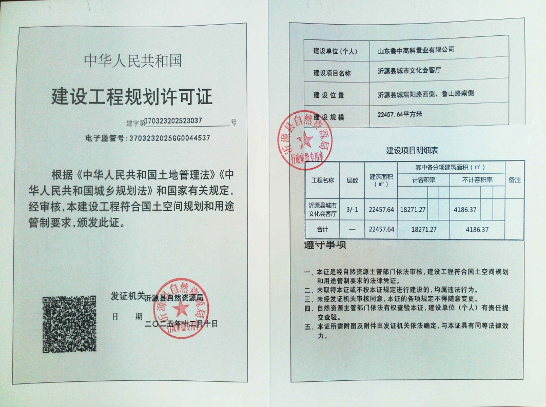 建设工程规划许可证批后公示【2025-37】山东鲁中高科置业有限公司:沂源县城市文化会客厅