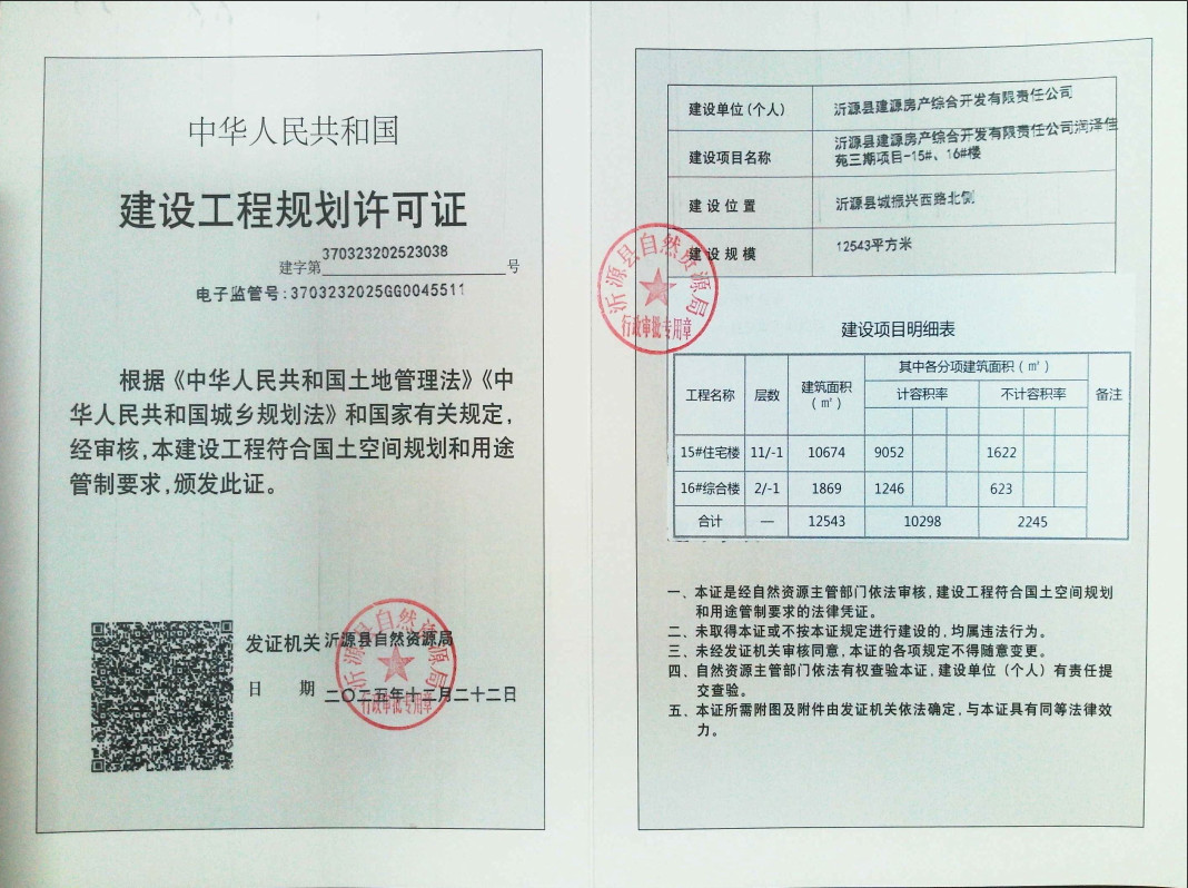 建设工程规划许可证批后公示【2025-38】沂源县建源房产综合开发有限责任公司润泽佳苑三期项目-15#、16#楼