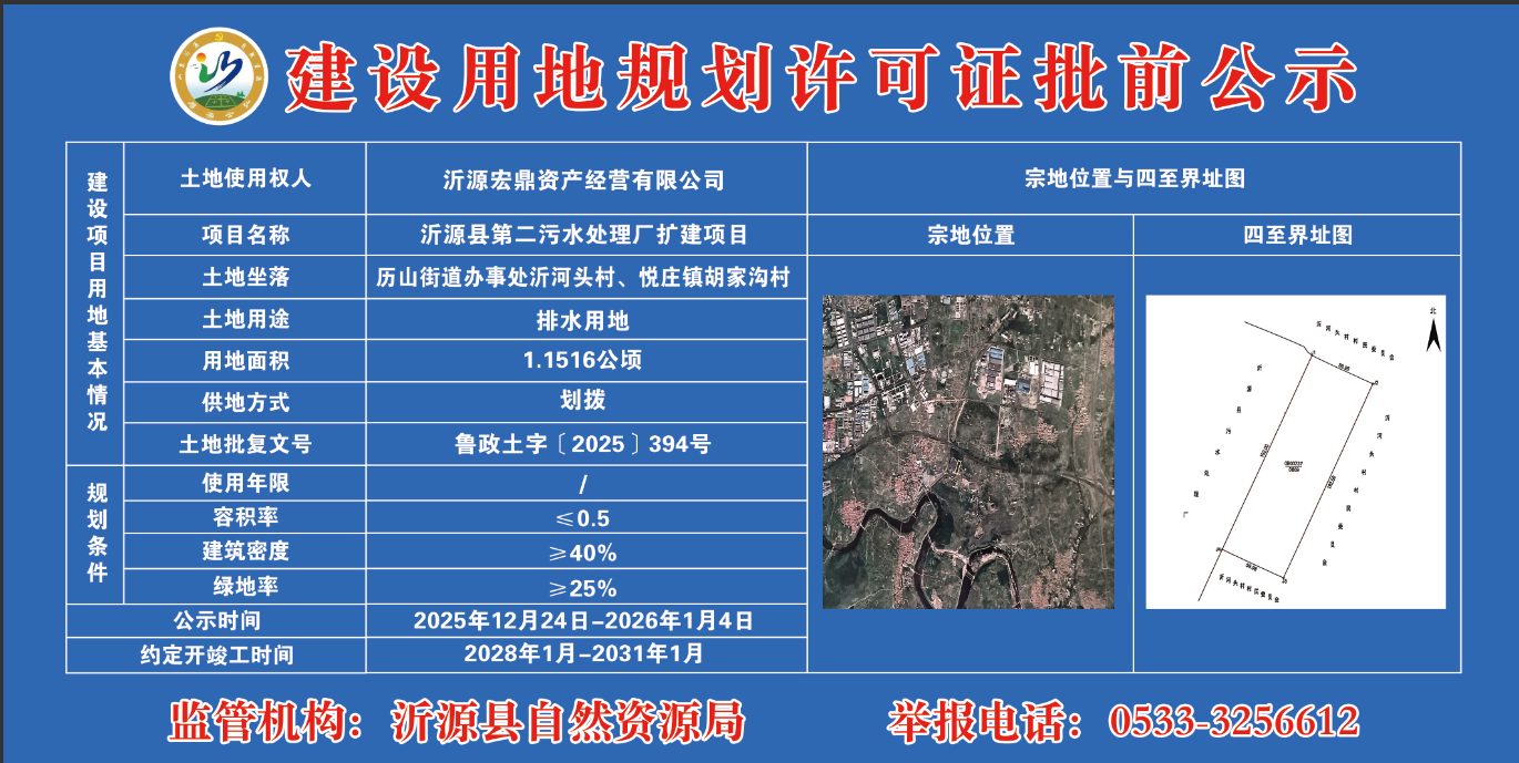 建设用地规划许可证批前公示【2025】沂源县第二污水处理厂扩建项目