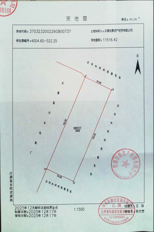 建设用地规划许可证批后公示【2026-1】沂源宏鼎资产经营有限公司沂源县第二污水处理厂扩建项目